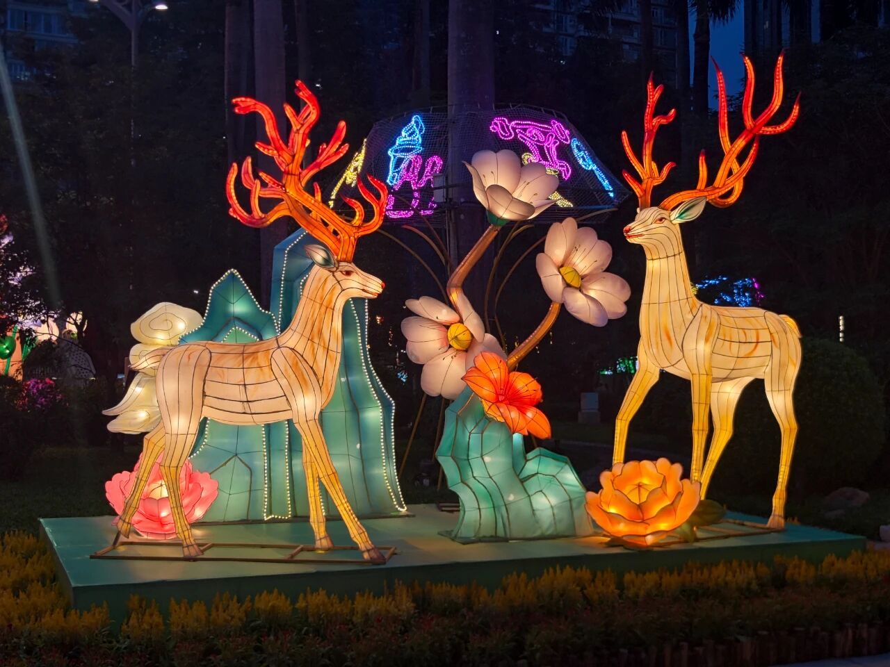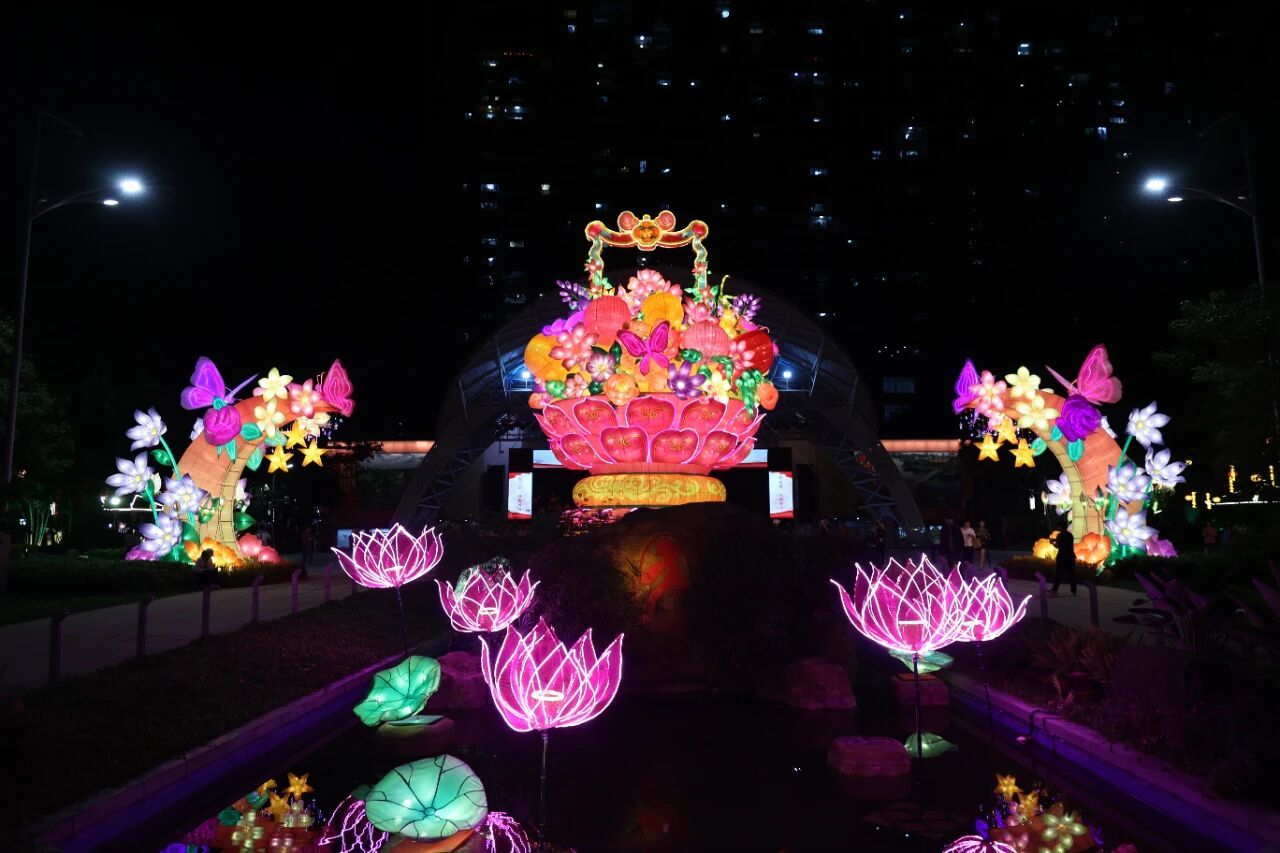 采用同样布展手法的灯组还有《花开映月耀湾区》《活力满溢》。其中,《花开映月耀湾区》花灯与湾区景致相映成趣,而各地市花的融入让彩灯更添灵韵,澳门的莲花灯瓣层层叠展,深圳的簕杜鹃以紫红焰态绽放,中山的菊花雅致高洁。月色、景致与花灯交织成画,既彰显了湾区各地的文化特质,更以“花开映月”的和谐图景,诠释着粤港澳大湾区同心同行、共绘繁华的美好愿景。