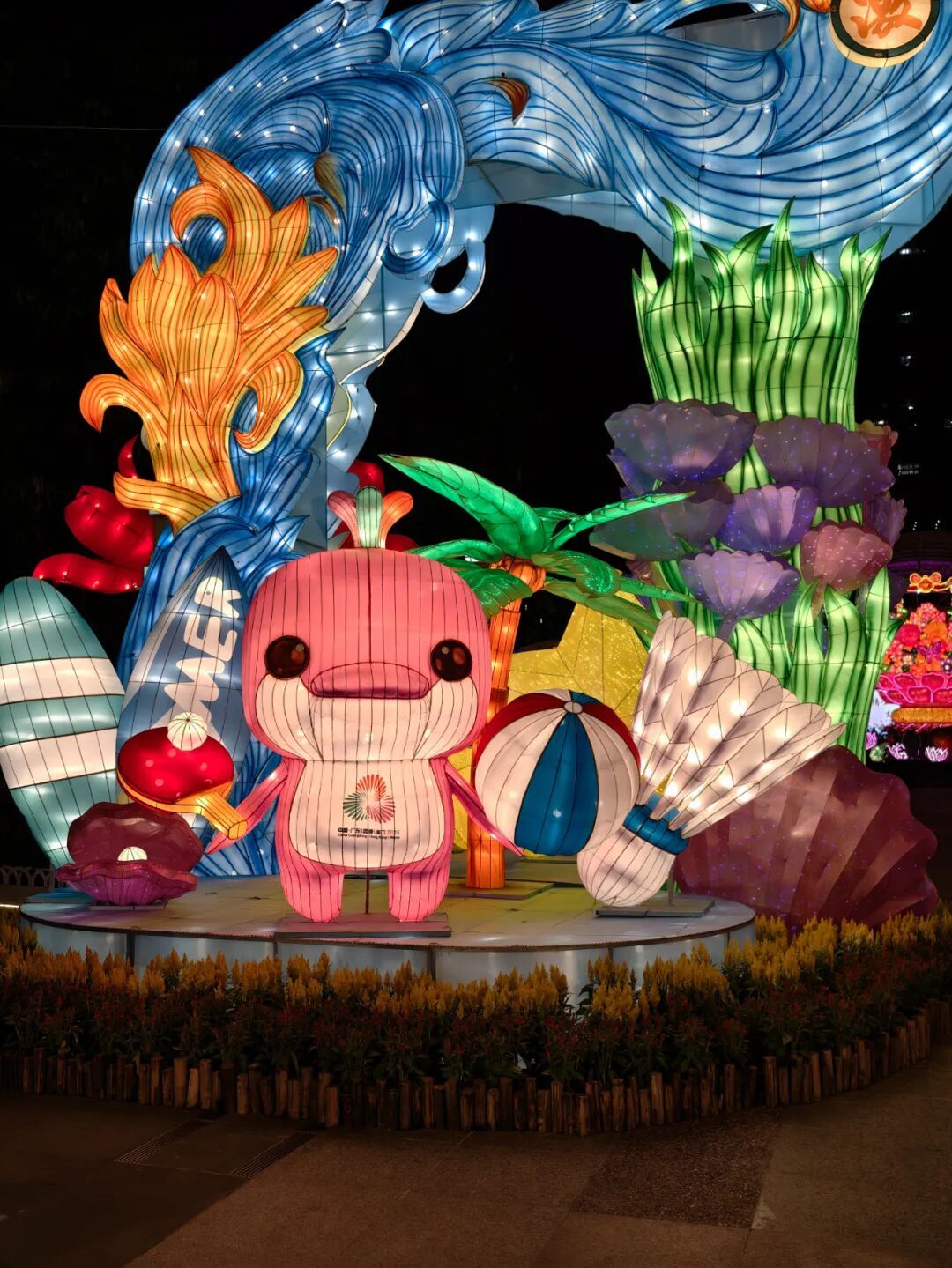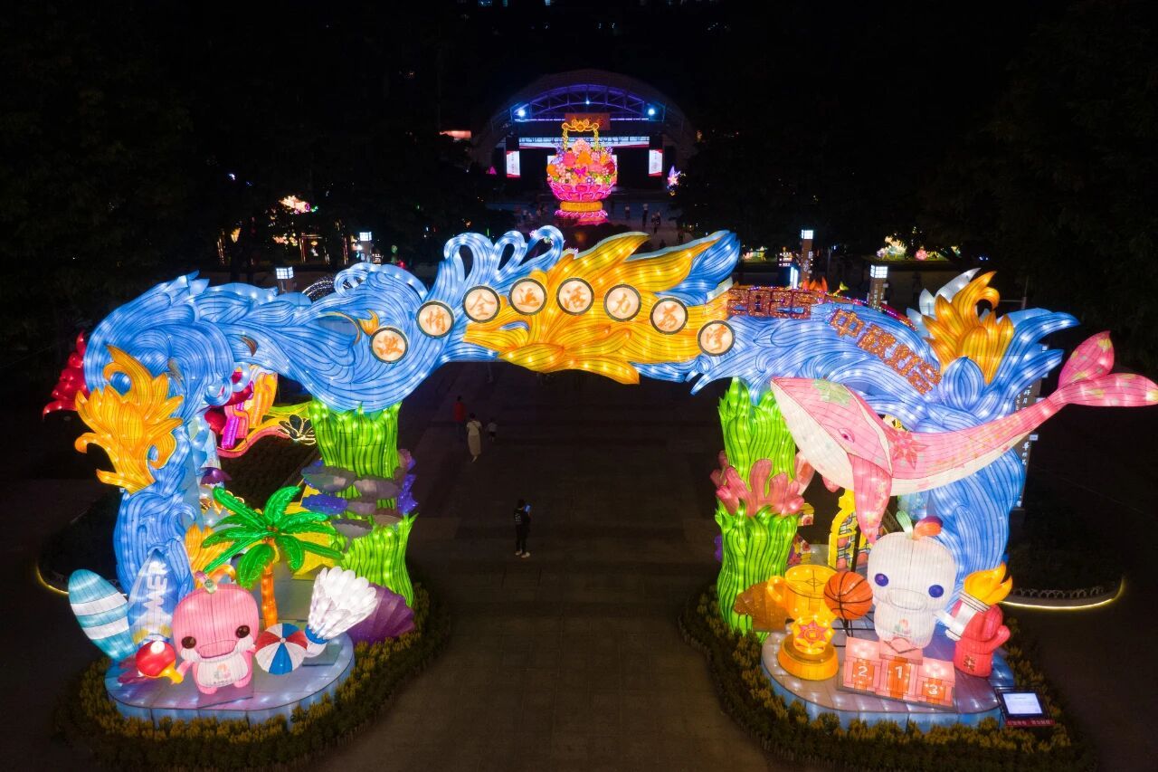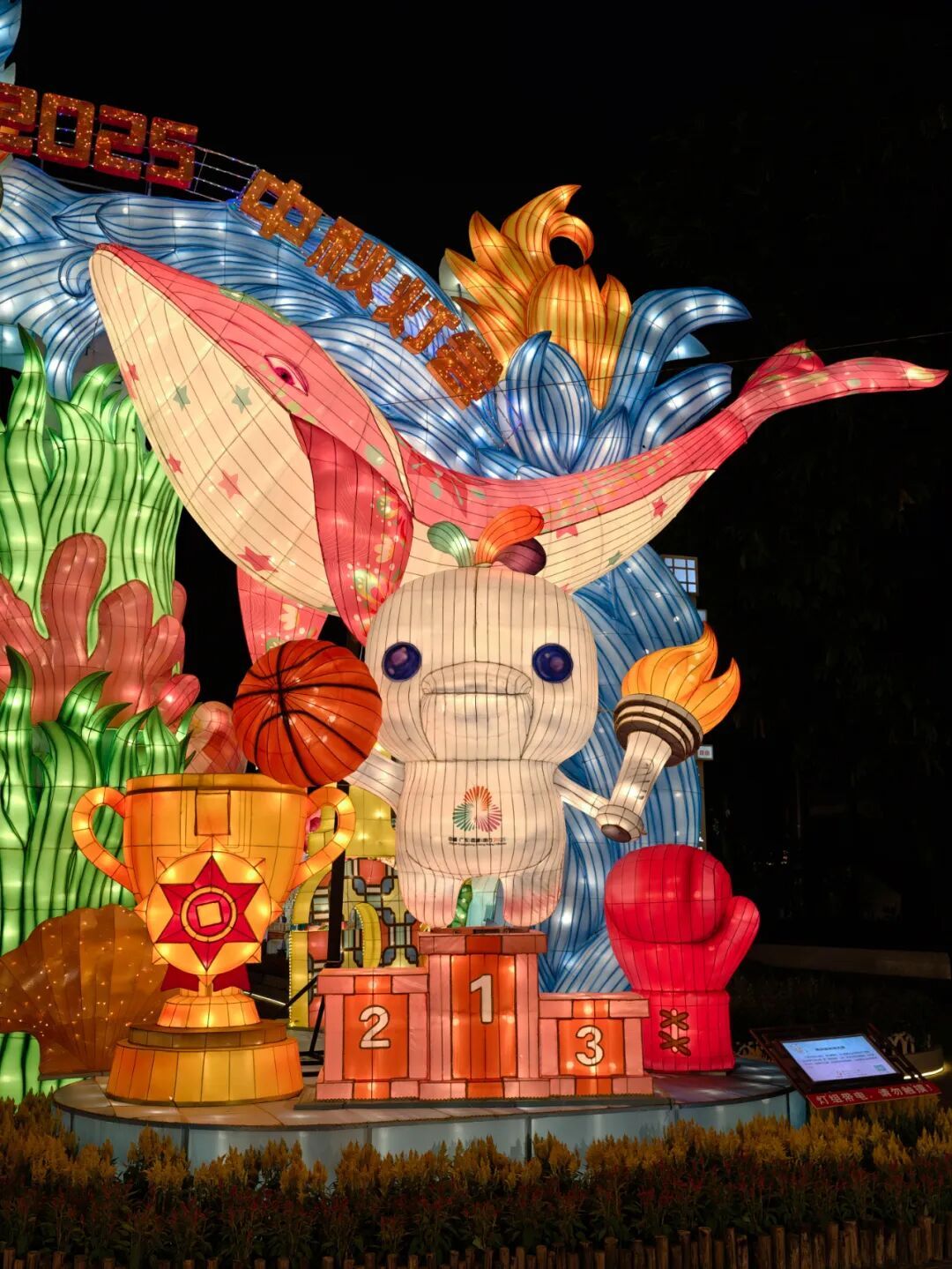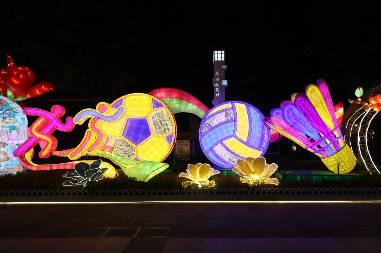 本届中秋灯会紧扣“喜迎十五运”主题,以《乘风破浪海天阔》为核心灯组,通过彩灯扎作工艺与现代灯光技术,呈现运动节奏与光影律动的视觉盛宴。