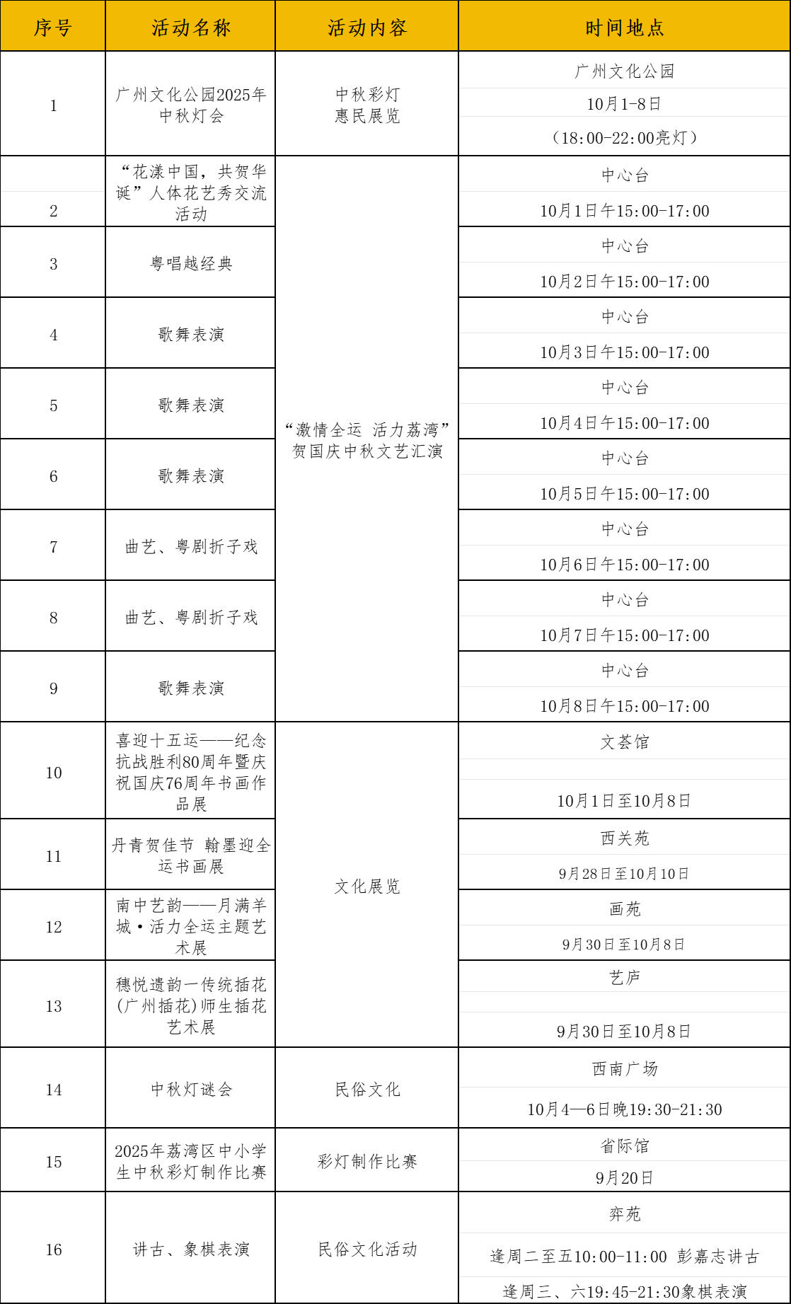 演出活动方面:中秋国庆期间,文化公园将举办7场以“激情全运 活力荔湾”为主题的文艺汇演活动。系列活动涵盖多种表演形式:“粤唱越经典”专场将演绎脍炙人口的经典粤语歌曲;多场歌舞表演融合现代与民族元素,呈现丰富多彩的舞台艺术;曲艺及粤剧折子戏专场则集中展示岭南传统戏曲的独特魅力,演绎戏曲经典选段。所有演出均围绕欢庆国庆、喜迎中秋及祝福全运会的主题,通过声乐、舞蹈、戏曲等艺术形式,展现湾区文化的活力与多元特色。