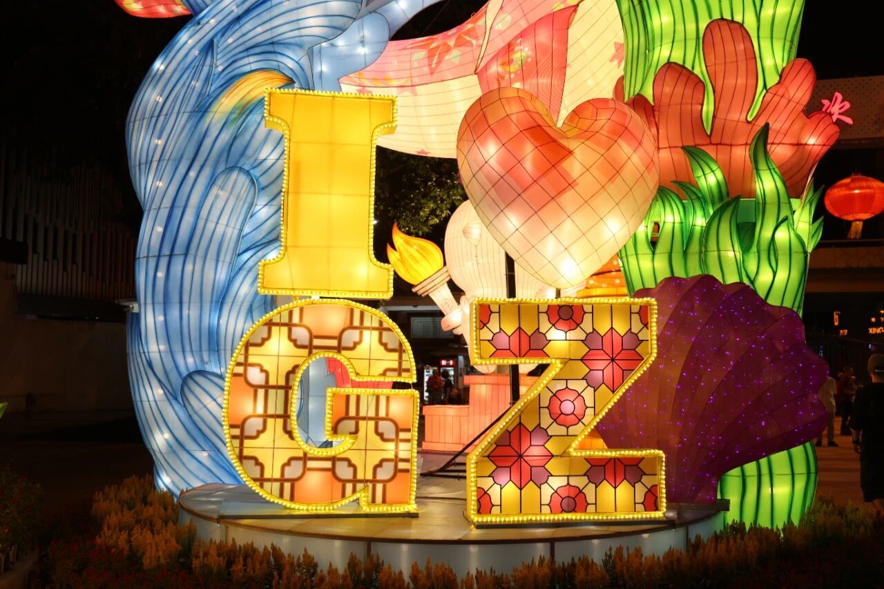 灯组《我爱广州》以直白又热烈的符号表达着对广州的深情,更在工艺与设计上巧妙融合多种新材料。除了运用传统的丝架扪衬工艺,在饰面装饰上还使用了创新打印工艺,色丁布印色加闪粉喷绘等工艺,同时融合具有广州建筑特色的满洲窗花纹,让灯组瞬间染上浓厚的广州西关风情,唤起人们对广州这座城市的文化记忆。