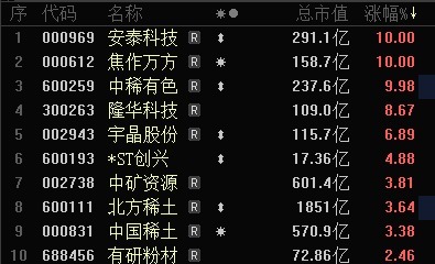 【大河财立方消息】1月12日,稀土永磁概念延续上周强势,焦作万方、安泰科技、中稀有色等个股触及涨停宏琳优配,万朗磁塑、中国稀土、北方稀土、盛和资源冲高。
